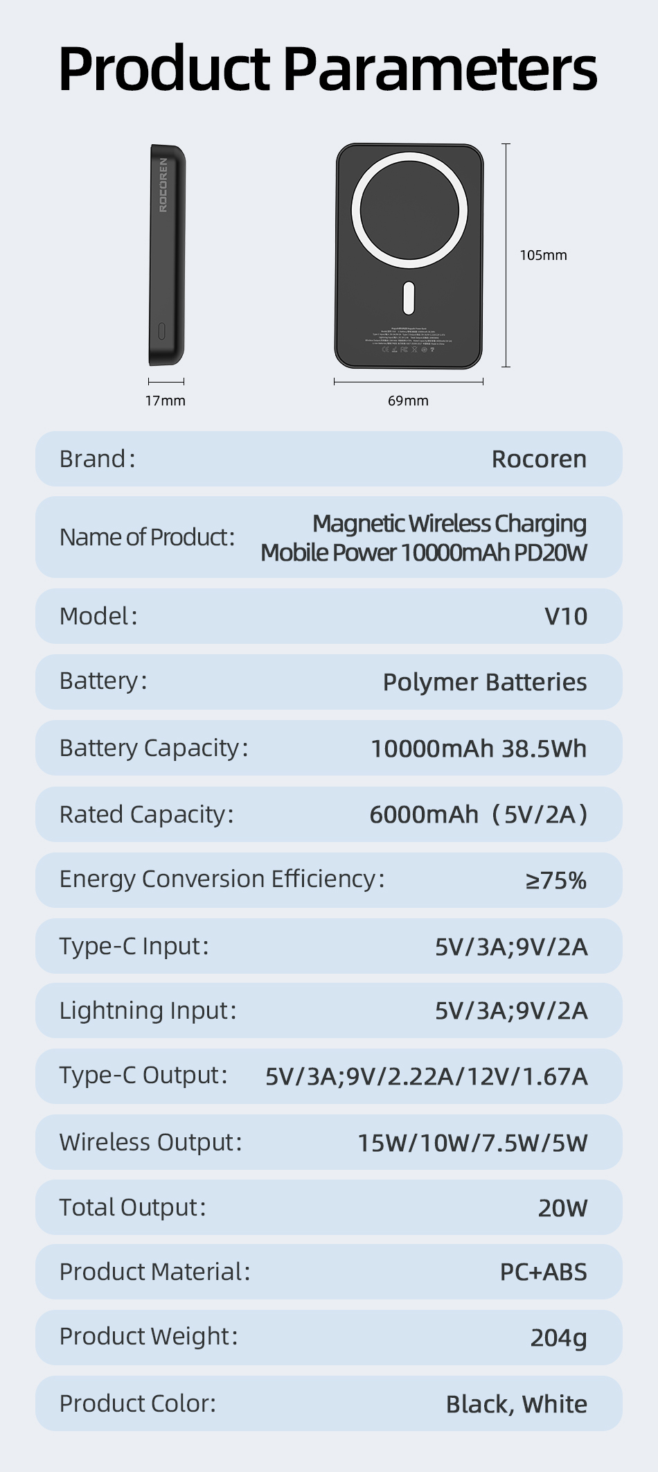 | Output | Type-C Output:5V⎓3A,9V⎓2.22A,12V⎓1.67A Wireless Charging Output: 15W Max |