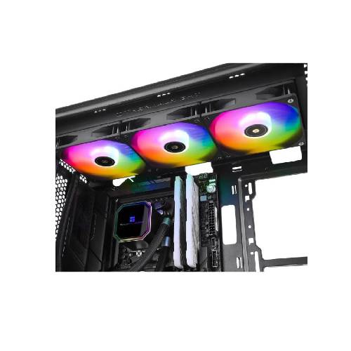 The Thermalright Frozen Prism 360 BLACK ARGB All-In-One CPU Liquid Cooler is a cutting-edge cooling solution designed to meet the demands of high-performance computing systems. With a sleek and stylish design, this cooler not only ensures efficient heat dissipation but also adds a touch of aesthetic appeal to your rig. At the heart of this cooling system is a robust aluminum radiator that efficiently dissipates heat generated by your CPU. The 360mm radiator, equipped with three 120mm * 120mm * 25mm fans, delivers a remarkable maximum airflow of 70.4 CFM. These fans operate quietly, with a noise level capped at 27 dBA, ensuring a balance between effective cooling and a peaceful computing environment. The water cooling mechanism enhances thermal performance, and the pump plays a crucial role in maintaining optimal temperatures. The pump, with dimensions of W61.7mm x D61.7mm x H53mm, operates at a rated speed of 3300 RPM±10%, ensuring a rapid and consistent flow of coolant. Despite its powerful performance, the pump remains impressively quiet, with a noise level of 23 dBA at maximum speed. The 4 PIN PWM connector provides precise control over fan speeds, allowing users to customize cooling performance based on their system requirements. Additionally, the ARGB connector with a 3 PIN 5V interface adds a vibrant and customizable lighting element to your setup. The cooler not only excels in performance but also stands out with its eye-catching RGB lighting effects, making it a perfect choice for those who prioritize both form and function in their gaming or workstation builds. With its durable materials and meticulous engineering, the Thermalright Frozen Prism 360 BLACK ARGB All-In-One CPU Liquid Cooler offers a reliable and efficient cooling solution for enthusiasts and professionals alike, ensuring that your CPU operates at optimal temperatures even during the most demanding tasks. Upgrade your system with this state-of-the-art cooler and experience a blend of high-performance cooling and stunning aesthetics.