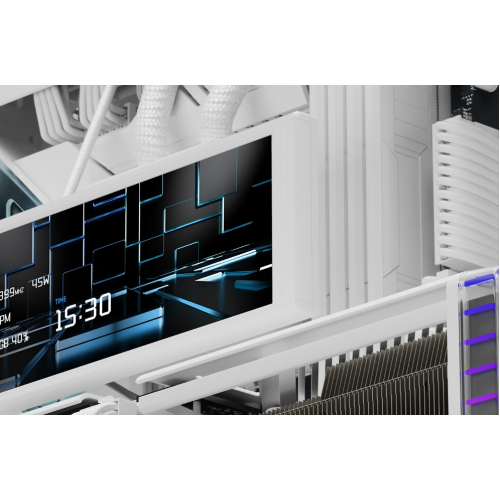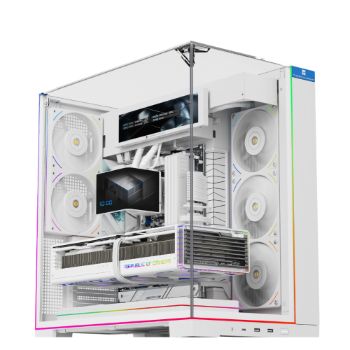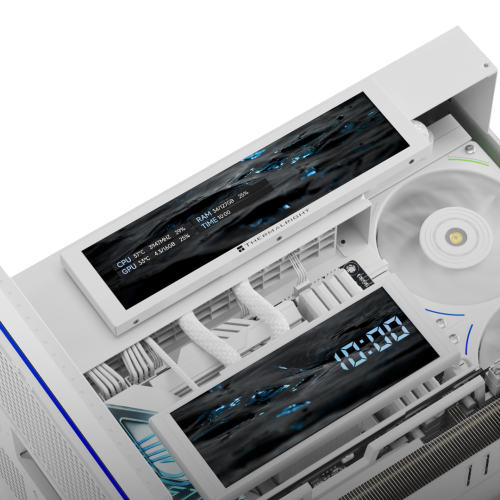 The hallmark of the TR-A70 is its seamless tempered glass wrap-around design. By utilizing a dual-chamber internal layout, Thermalright hides the power supply and cable clutter behind the motherboard tray. This creates a clean, unobstructed view of your GPU, cooling loops, and the integrated LCD status display. This customizable screen provides real-time monitoring of CPU/GPU temperatures or personalized GIFs, adding a layer of interactive tech-sophistication.