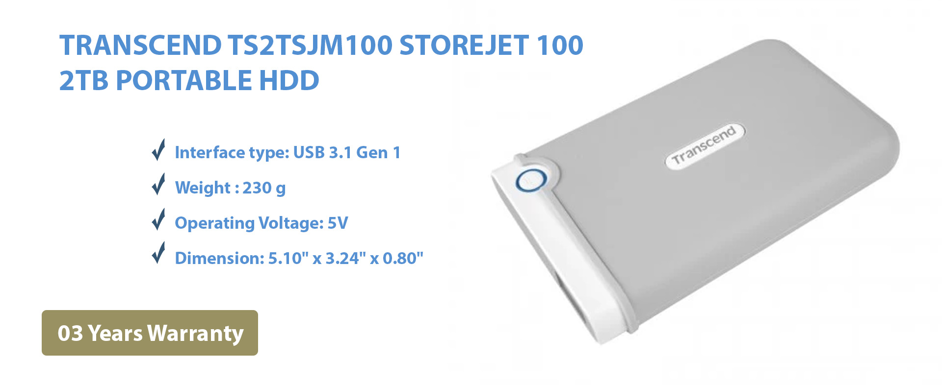 Exclusively for your Mac, Transcend’s StoreJet for Mac SJM100 Portable Hard Drive provides immense storage space and offers superior data transfer speeds. The SJM100 combines the U.S. military-grade shock resistance with a SuperSpeed USB 3.0 interface. Ideal for your portable device, the SJM100 HDD is HFS+ pre-formatted and fully supports Time Machine. TRANSCEND TS2TSJM100 STOREJET 100 2TB PORTABLE HDD comes with 03 Years Warranty.