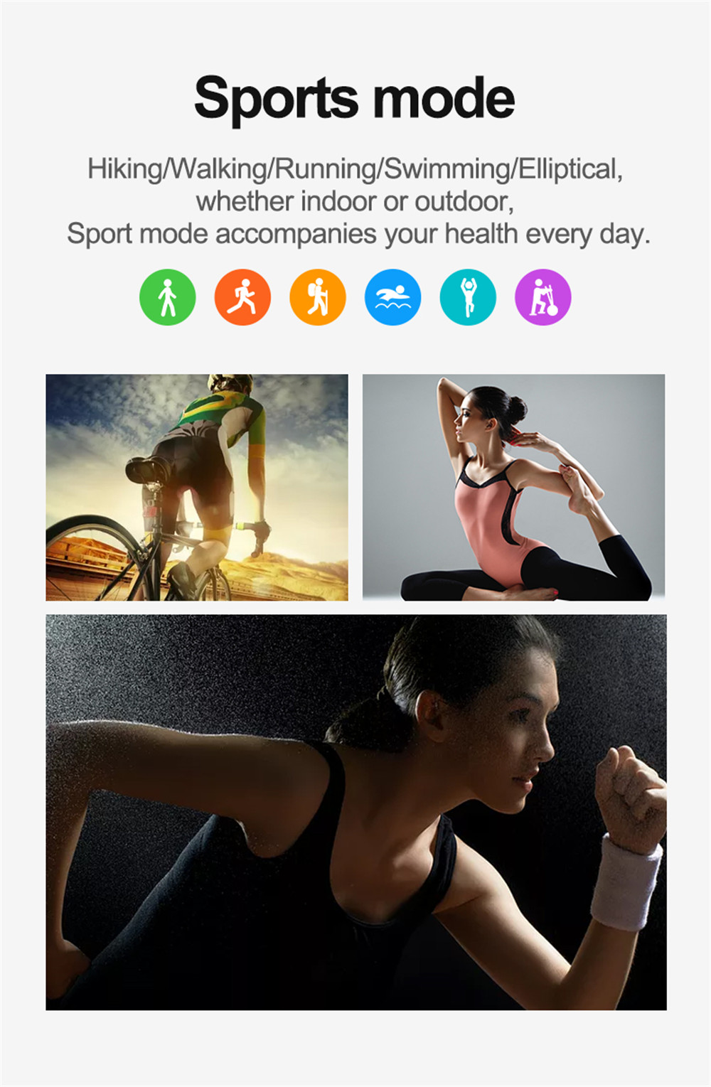 | Others | Heart rate sensor Body size: 44mm * 38mm * 12.5mm External flash: 64M Time display: support Count: Support Calories: Support Distance: Support Sports mode: support (yoga/disc machine/climbing/swimming/running/strike) |