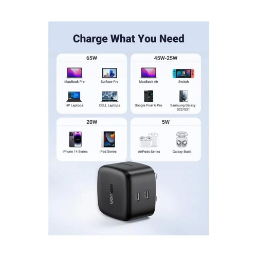 Upgrade your charging experience with the Ugreen CD216 (70868) 65W PD Dual USB-C Black Fast Charger / Charging Adapter #70868 and enjoy fast, efficient, and reliable power for all your devices. Say goodbye to slow charging and hello to convenience and productivity.