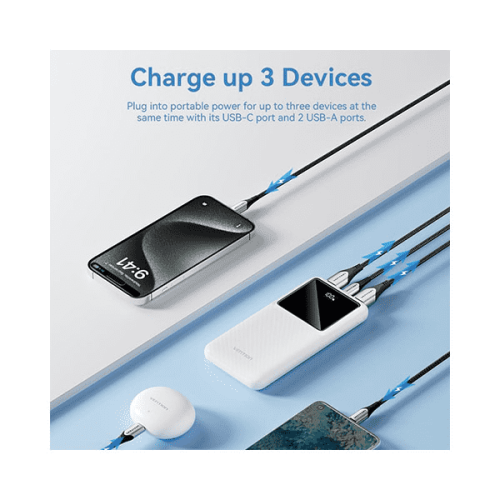 VENTION FHKW0 10000mAh LED Display Power Bank- Keep your device charged wherever you go with a powerful capacity of 10000mAh. It will be able to charge an iPhone 15 Pro fully two times or 1.6 times for a Xiaomi 13. Equipped with a 22.5W/20W PD output, it will support the following fast charging protocols: SCP, QC 3.0, FCP, AFC, and Apple 2.4A. This power bank has one USB-C port and two USB-A ports, which enable you to charge up to three devices simultaneously.