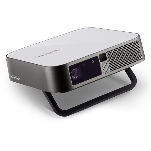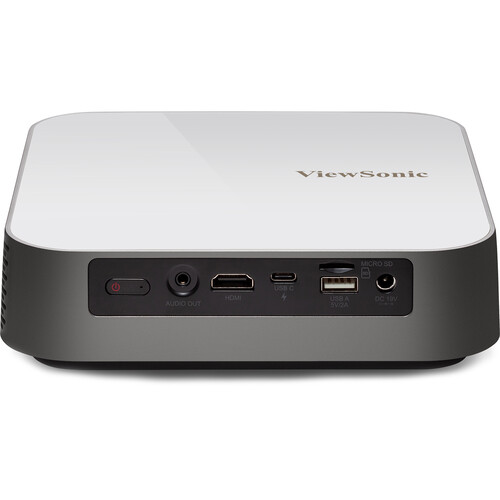 The ViewSonic M2e is a 1000-Lumen Full HD Smart DLP Projector. Its 1000 lumens of brightness can produce images up to 100" diagonal in moderately lit rooms, and it's compact. Shorter throw lens project up to 100-inches from 8-feet 9-inches. Thanks to a built-in auto-focus feature, as well as horizontal and vertical keystone correction It s quick and easy to set up. Enjoy a crystal-clear image no matter where you place your projector. The M2e has dual 3W Harman Kardon speakers built-in to eliminate the need for external speakers, simplifying its ease of transport and setup. ViewSonic Cinema SuperColor+ technology delivers 125% of Rec.709 color accuracy and HDR content support that produce incredibly vivid and lifelike colors for a fuller, more immersive viewing experience. It also has onboard HDMI, USB Type-A, and USB Type-C ports, plus a microSDXC card slot, enabling you to project from multiple types of source devices. Wi-Fi and Bluetooth connectivity is built-in, so you can stream from your compatible phone or tablet. Bluetooth connectivity also allows pairing with compatible headphones or speakers for added versatility. This projector uses solid-state LED technology that is free of mercury, lamps, and filters. The LED light source provides up to 30,000 hours of usage while consuming less than half the power of a typical LCD TV, thereby lowering your total cost of ownership. Its lightweight design allows it to be easily carried around. A tripod mount on the bottom allows for a quick, easy setup at trade shows, conferences, classrooms, and more. It has a 1-year warranty.