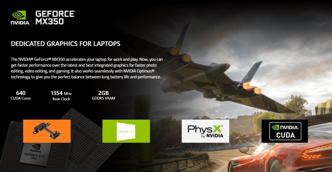 The NVIDIA® GeForce MX350 Accelerates Your Laptop For Work And Play. Now, You Can Get Faster Performance Over The Latest And Best Integrated Graphics For Faster Photo Editing, Video Editing, And Gaming. It Also Works Seamlessly With NVIDIA Optimus Technology To Give You The Perfect Balance Between Long Battery Life And Performance