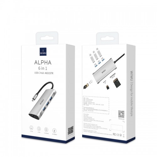 The WiWU Alpha 631STR 6-in-1 Multi-function Type-C Hub Adapter comes with RJ45+3x USB 3.0+ SD+ Micro SD. It provides extra 3 USB 3.0 ports for supporting up to 5Gbps transfer speed. It enables you to easily access files from an SD card and/or a TF card directly. It supports both upward and downward charging and data transmission. It is compatible with Mac OS, Windows, Linux, Android. It comes in Aluminum Alloy housing. It can reduce heat effectively. It is compatible with devices with a Type-C interface. It is very easy to carry. It has no warranty.