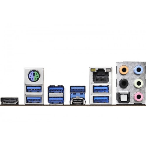 | Internal I/O Ports | - 1 x PS/2 Mouse/Keyboard Port, - 1 x HDMI Port, - 1 x Optical SPDIF Out Port, - 1 x USB 3.1 Gen2 Type-A Port (10 Gb/s) (Supports ESD Protection), - 1 x USB 3.1 Gen2 Type-C Port (10 Gb/s) (Supports ESD Protection), - 6 x USB 3.1 Gen1 Ports (Supports ESD Protection), - 1 x RJ-45 LAN Port with LED (ACT/LINK LED and SPEED LED), - HD Audio Jacks: Rear Speaker / Central / Bass / Line in / Front Speaker / Microphone, Software and UEFI, Software |