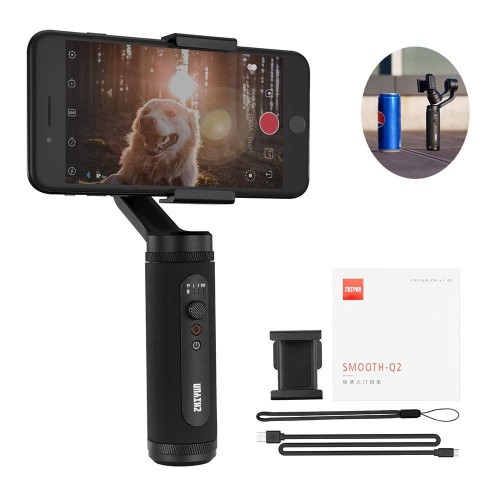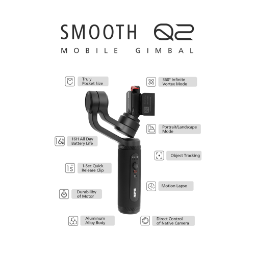 Zhiyun Smooth Q2 is The Truly Pocket-Size Smartphone Gimbal, that has come a long way in exploring the ultimate compact form factor without any compromise in functionality. The Smooth Q2 engaging gimbal ready to work without any fuss, the ultimate smartphone gimbal redefining the concept of compactness. The aluminum-built miniaturized body is crafted for maximum solidity. Coated with soft silicone, the handle is comfortable in your hand. It measuring only 204mm long and almost equivalent to a sunglass case. Unfold the axis and ready for content creation and you can Shoot in the angle that you want. It Switch among versatile modes with one button. Besides Pan Following Mode, Following Mode and Lock Mode, this SMOOTH-Q2 integrates Vortex Mode which gives videomakers the freedom to capture 360-degree barrel shots in all dimension. Here, Newly added Full-Range POV Mode allows 360-degree synchronous movement on three axes, providing an immersive effect to the video. This new Zhiyun Smooth Q2 supports direct control to native iOS and Android phone cameras for photo and video taking, providing a fast lane for you to capture the moments. It's Quick Release Latch helps to Instant On and Off. In this Smooth Q2 Gimbal, the new generation algorithm allows you to enter a new portrait mode in an effort-saving manner and also you can Live stream now. It's battery life is up to 17 hours with a rechargeable battery. The SMOOTH-Q2 has a micro-USB port that allows it to work as power bank. This Gimbal has filmmaking functions, such as timelapse, vertigo shot, object tracking, and panorama, etc.