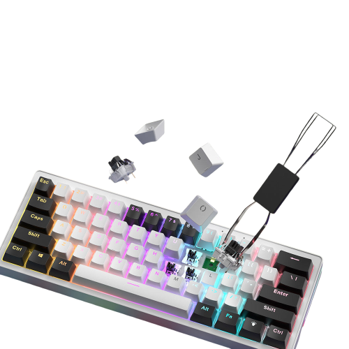 The keyboard features hot-swappable switch sockets (typically 3-pin), allowing for easy customization of the typing experience without soldering. It is commonly equipped with linear Yellow Switches or ultra-quiet Mute Switches. The visual appeal is enhanced by both Rainbow RGB backlighting and distinct Side RGB Streamer lighting that runs along the sides of the case.