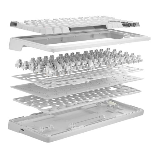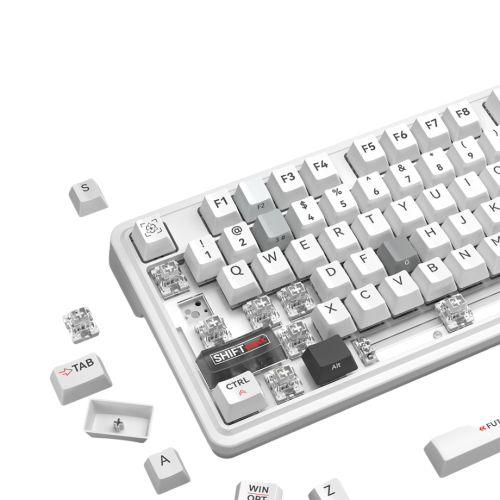 The keyboard supports Full Key Hot-Swappable sockets (both 3-pin and 5-pin), allowing users to easily change out the pre-installed mechanical switches (such as White or Noah Silver switches) without soldering, facilitating total customization of the typing feel.